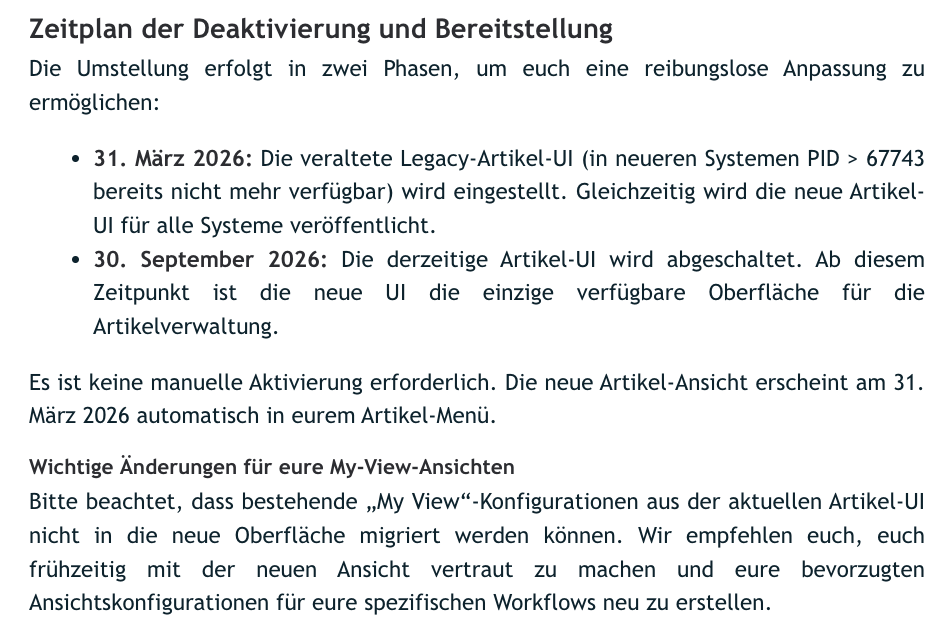 heute kam ja die Email, dass es eine neue Artikel UI geben wird ab 31.3. und damit die heute ganz alte Artikel UI abgeschaltet wird. Am 30.9. wird dann die heute “neue” Artikel UI abgeschaltet und nur noch die ganz neue bleibt bestehen.