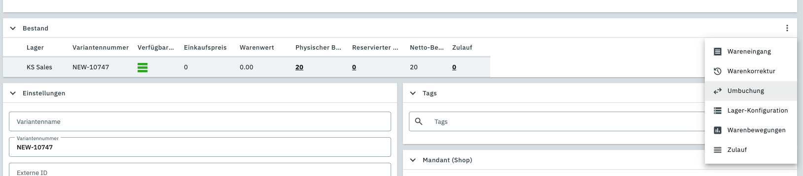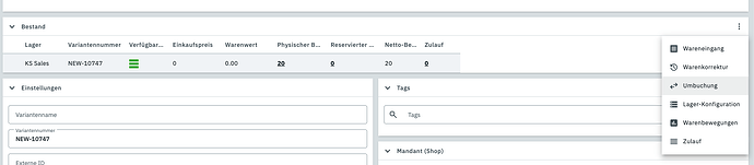 Mir ist völlig unklar wo ich Bestände zubuche. Ohne vorherigen Bestand tauchen Varianten gar nicht erst in der Bestandsübersicht auf.