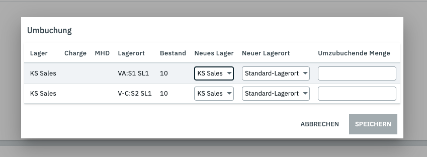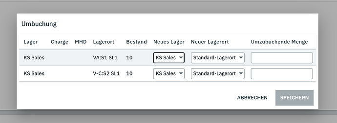 eine Übersicht, der Lagerorte und die damit verbundene Möglichkeit umzubuchen, findest du an der Variante im Bestands-Portlet bei dem 3-Punkte Menu unter Umbuchung: