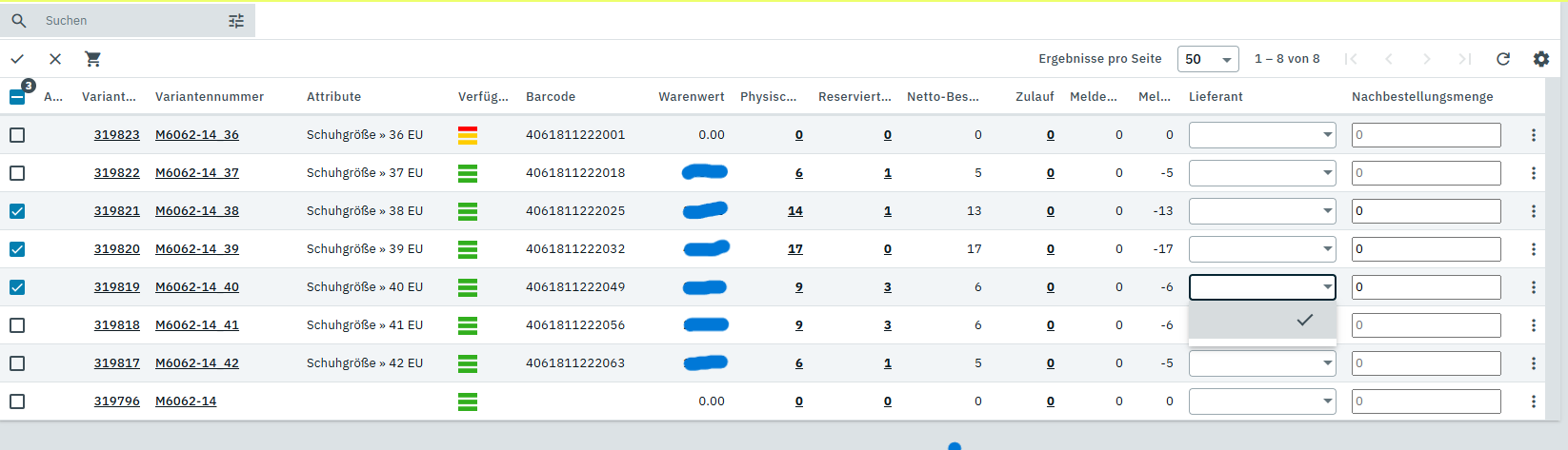 Außerdem verstehe ich noch nicht warum die Varianten dort nicht sichtbar sind, wenn sie gerade neu angelegt wurden und noch keinen Bestand haben. So wird mir ja ebenfalls verwehrt über jene Bestandsübersicht (wenn der Lieferant auswählbar wäre) die Bestände ein zu buchen und von dort aus eine Bestellung aus zu lösen.