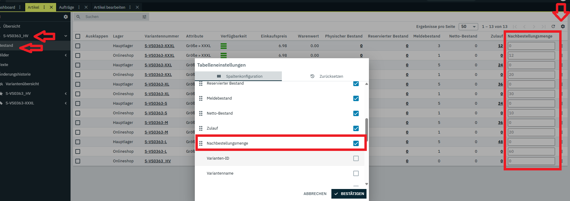 Du musst an der Hauptvariante auf Bestand gehen, dann werden Dir alle Varianten angezeigt.
