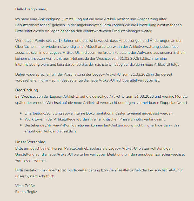 Das sehe ich anders. Wir und viele andere haben um keine Änderung gebeten, im Gegenteil: viele haben Feedback gegeben im alten Forum, dass es Käse ist mit dem Ende, dass Plenty sagt, wir haben uns die neue UI extern viel Geld kosten lassen und dann wird das jetzt auch so durchgezogen, auch wenn wir zugeben müssen, dass vieles suboptimal ist und in der neuen UI länger braucht und mehr Klicks nach sich zieht. Immerhin gab es die Möglichkeit einfach die alte Ansicht weiter zu nutzen, was ja gewollt war, sonst wäre sie ja schließlich entfernt worden. Dafür jetzt aber mit unnötiger Arbeit abgestraft zu werden doppelt migrieren zu müssen ist hier dann wie nachvollziehbar? Anstelle einfach eine minimale Spanne zu bieten, sofern v3 auch zuverlässig funktioniert, um nur einmal umstellen zu müssen. Einen technisch nachvollziehbaren Grund scheint es ja nicht zu geben, sonst wäre dieser ja bereits kommuniziert worden. Also bleibt nur, wollen wir halt nicht und das ist für mich kein nachvollziehbarer Grund, wenn er für mich entsprechenden Aufwand bedeutet.