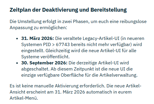 Ich weiss nicht wie es andere Betriebe handhaben, aber wir sind bislang damit am besten gefahren uns mit neuen Features erst dann intensiv zu befassen, wenn das Enddatum für den Vorgänger steht. Wobei wir in diesem Fall die alte neue Artikel-UI ja auch jetzt schon nutzen, weil sie manches einfach besser kann als die alte alte UI.