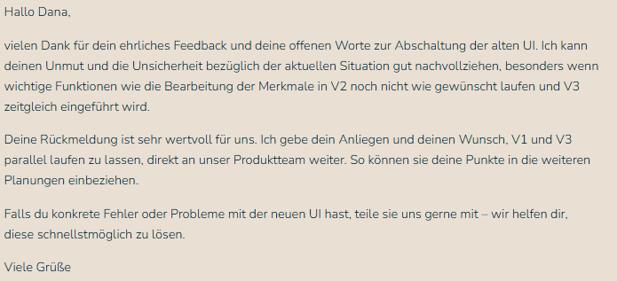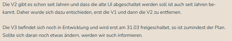 Jetzt wird zum 31.03. die (aus meiner Sicht) voll funktionsfähige V1 UI abgeschaltet und die nicht fertige V2 UI bleibt erhalten, nur weil man auf biegen und brechen neue User schon direkt auf die neue UI zwingen wollte.
