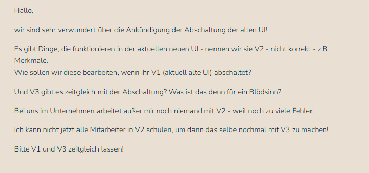 Sehe ich auch so. Wobei man auch gerade V1 und V2 zeitgleich abschalten kann. Dann haben beide Nutzer der “alten” UIs die gleiche Zeit und Möglichkeit sich an die neue zu gewöhnen. Vielleicht löst das aber auch zu viele Rückfragen oder Nutzerprobleme für den Support aus, die man sich so stückeln kann. Wer weiss…