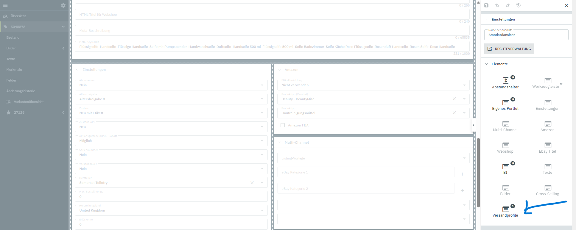Du musst dieses Symbol Versandprofile anklicken, gedrückt halten, und in deine Ansicht reinziehen. Die 1 bedeutet, dass die Kachel nur 1x genutzt werden kann.