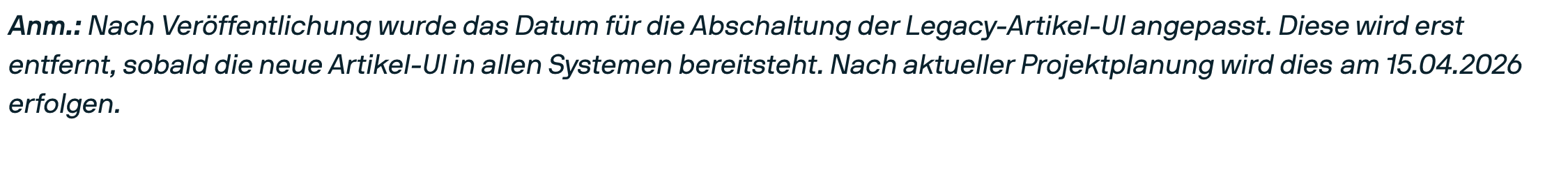 Die Abschaltung der alten (Legacy) Artikel-UI ist für den 15. April 2026 geplant.