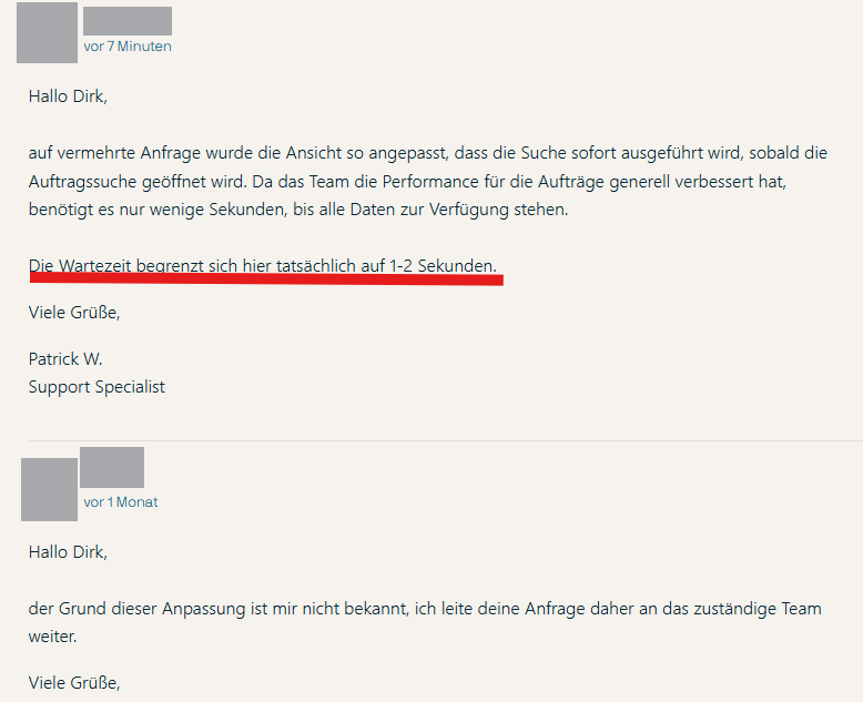 Wenn ich einen Auftrag suche, muss ich immer warten, bis alle Aufträge geladen sind - erst dann kann ich nach einem bestimmten Auftrag suchen.