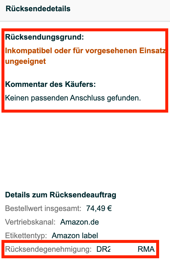 Die in Amazon sichtbaren Rücksendedetails und die Rücksendegenehmigungsnummer (RMA) stehen in plenty aber nicht zur Verfügung – gerade diese Infos wären für die Bearbeitung von Retouren extrem hilfreich: