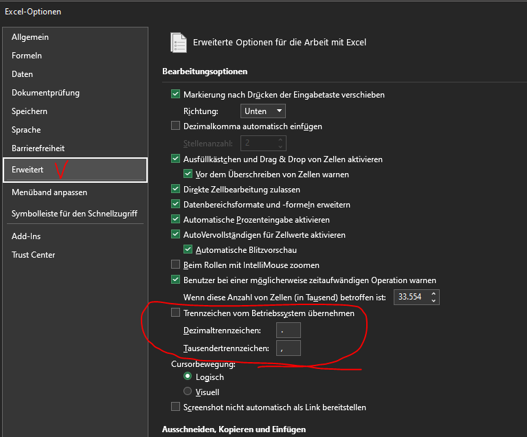 Ich weiß nicht, ob es dir weiterhilft, aber ich hatte damals eine (eigentlich nicht so) ähnliche Situation, als ich eine in einer anderen Sprache generierte CSV-Datei geöffnet habe. Ich habe die folgenden Einstellungen in Excel entsprechend angepasst und es hat funktioniert:
