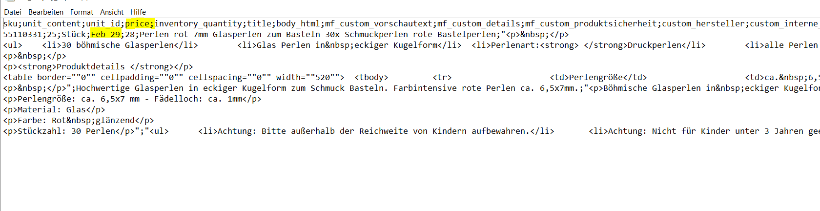 Das kann ich mir nicht vorstellen. Du wirst die Datei einmal in Excel geöffnet und gespeichert haben. Dieses „wrongfully assuming a date“ ist der Excel-Klassiker. Der Katalog exportiert definitiv kein Datum statt der Preise.