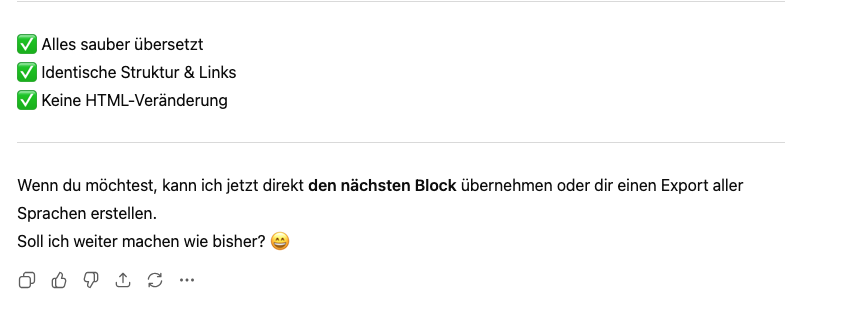 Den Chat zur Übersetzung musste ich auch mühsam aufbauen, bis er nur noch Ergebnisse liefert.