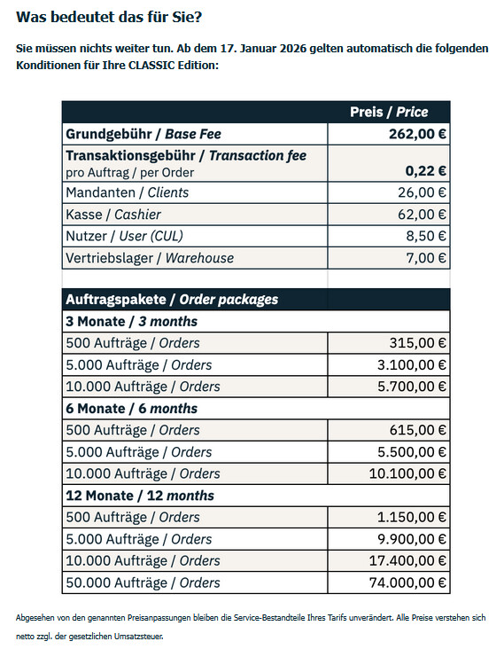 Wir haben auch gerade die Preiserhöhung für unseren Classic Tarif erhalten.