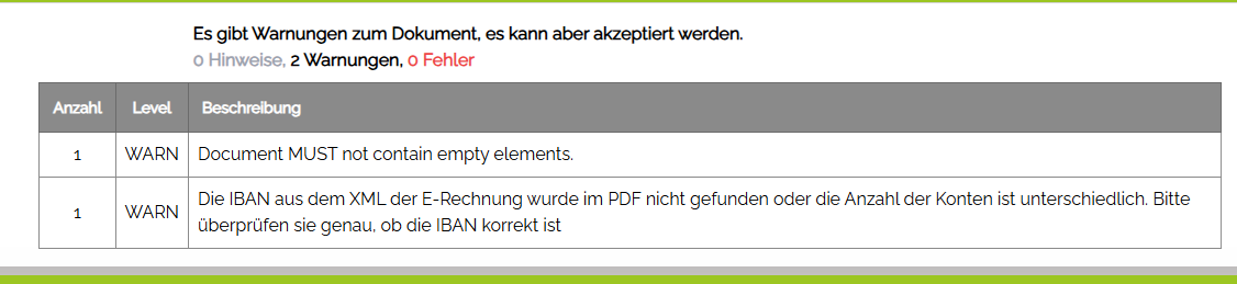 Warnungen sind in der Regel in Ordnung, die IBAN-Meldung haben wir zb auch, was aber an der PDF liegt, da dort unsere IBAN einen Umbruch hat.