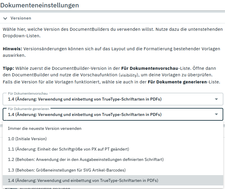 du kannst unter Einrichtung > Dokumente > Einstellungen sagen, welche Version für Vorschau und Dokumente generieren verwendet werden soll.
