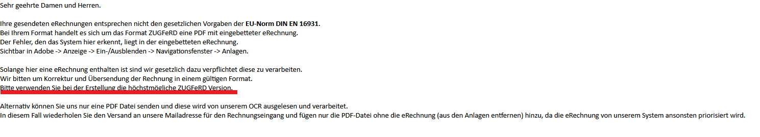 wir haben von einem Kunden eine Nachricht bekommen, dass das PDF mit angehängter ZuGFeRD E-Rechnung nicht verarbeitet werden kann.