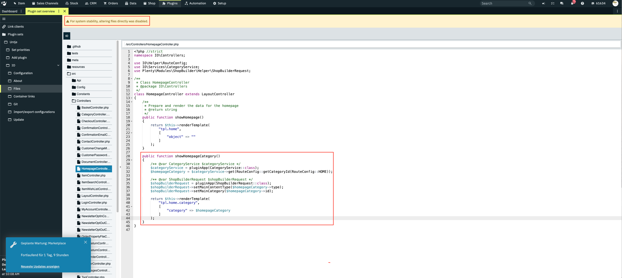 Unter Plugins > IO > files > src > Controllers > HomepageController.php wurden wir angewiesen, die showHomepageCategory() Funktion zu ersetzen, um eine Artikelkategorie als unsere Startseite anzuzeigen.