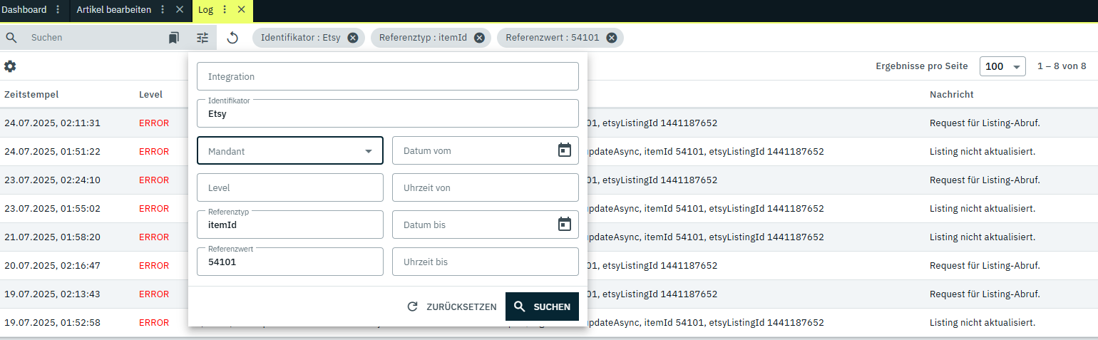 du kannst über das Log den Artikel zb. so aufrufen (Wenn du das log und dann den filter aufgerufen hast, dauert es manchmal ein paar sekunden bis du zb. etsy angezeigt bekommst)