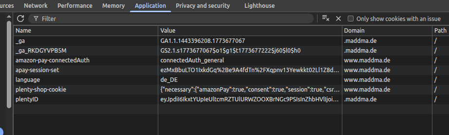 Davon abgesehen sind die Amazon Pay Cookies und auch die _ga Cookies nicht sauber eingestellt, bzw. das Plugin unsauber (Amazon Pay), wenn Cookies ohne Zustimmung gesetzt werden. Bis auf die Session Cookies sind eigentlich keine zugelassen ohne Zustimmung. Um die Zahlungsart Cookies wird immer mal wieder diskutiert.