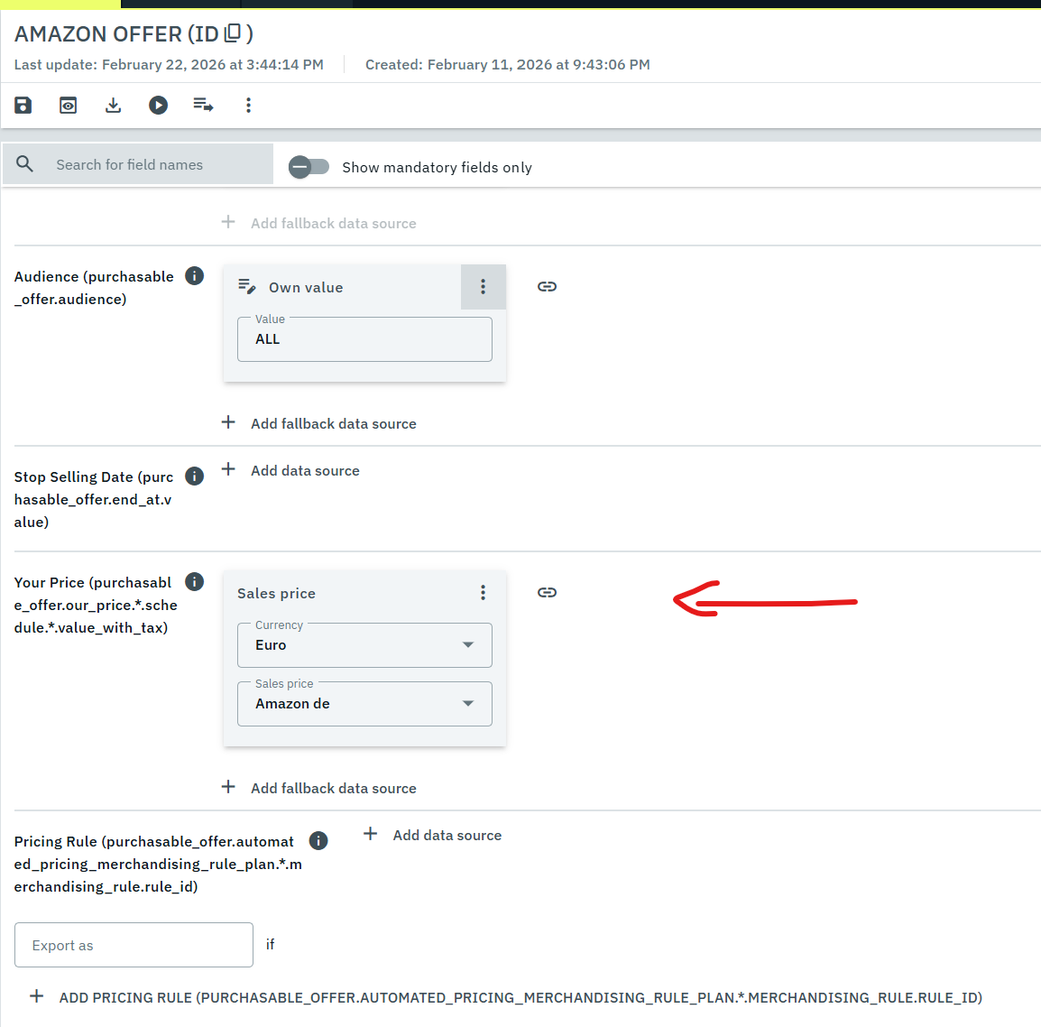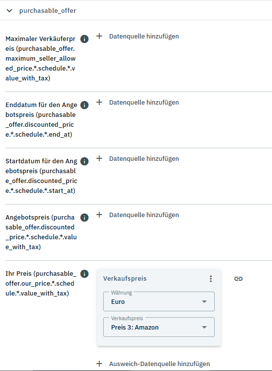 Die Preisübertragung erfolgt über den Angebotskatalog und ist in allen Feldern „purchasable_offer“ zu finden (es gibt mehrere, um FBA-/FBM- und B2B-Kunden zu berücksichtigen).