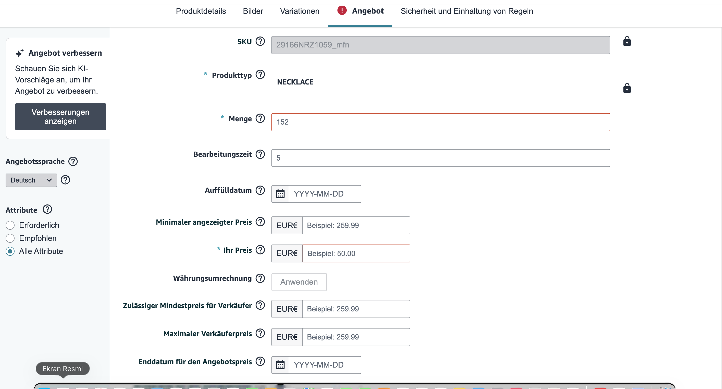 Im Seller Central wird das Feld „Ihr Preis“ als fehlend markiert (siehe Screenshot), obwohl ich im Katalog versucht habe, die Felder zu mappen.
