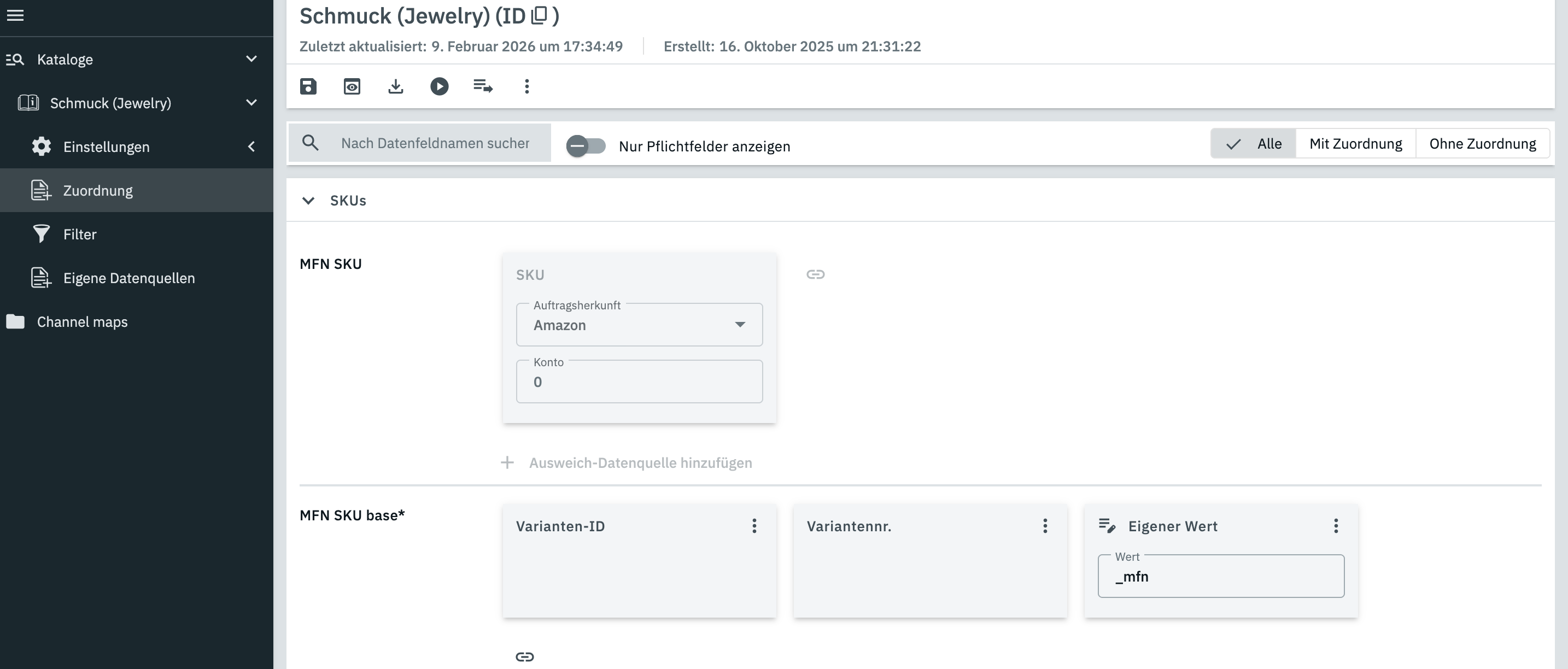 Meine Frage zum Katalog-Mapping: Im Produktkatalog sehe ich absolut keine Felder, um Preis (Price) oder Bestand (Stock) zu mappen. Da dies mein erster Amazon-Katalog ist: Ist das normal? Werden Preis und Bestand beim neuen Katalog-System nicht mehr direkt im Mapping-Prozess verknüpft, sondern separat über die Standard-Amazon-Einstellungen gesteuert? Oder fehlt mir hier ein komplettes Attribut-Set im Katalog?