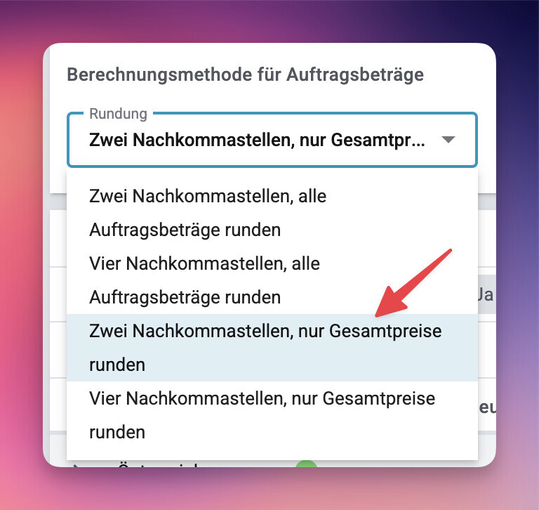 Einrichtung → Mandant → [Dein Mandant] → Standorte → [Dein Standort] → Buchhaltung → Allgemein → Berechnungsmethode für Auftragsbeträge