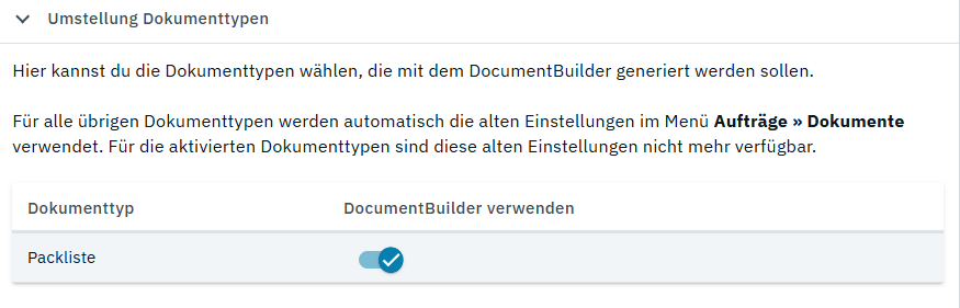 Als Erstes muss die Dokumentenvorlage für die Packliste im DocumentBuilder erstellt werden. Anschließend unter Dokumente → Einstellungen die Erstellung umstellen: