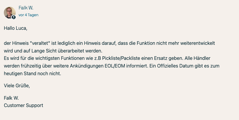 Seitens PlentyONE gibt es bislang keine offizielle, dokumentierte Ablösung oder einen neuen Nachfolge‑Prozess speziell für die Fulfillment‑Komponente mit Lager‑Picklisten. In der EOL‑Liste (End‑of‑Life) ist dazu auch noch nichts vermerkt: EOL: Beendigung Softwarepflege und Bereitstellung :: Handbuch PlentyONE