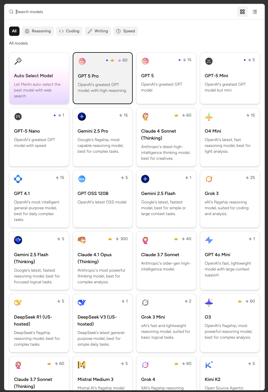 Ich teste derzeit Merlin, da ist ChatGPT 5 auch mit drin aber auch viele andere Pro-Modelle, Merlin wĂ€hlt entweder fĂŒr den Prompt passend die aus seiner Sicht beste KI aus oder man kann natĂŒrlich auch direkt bspw. GPT-5 Pro wĂ€hlen. Gibt verschiedene Pakete, je nach KI muss man mehr oder weniger Credits nutzen pro Anfrage, bis das Fair Use Limit erreicht ist: