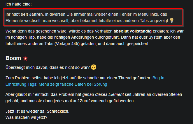 Bei den seitlichen Tabs in den AuftrĂ€gen ist es auch nicht besser, da wĂ€hlt man mitunter einen Auftrag aus und angezeigt wird ein anderer Auftrag, wenn man zu âschnellâ wechselt. Also noch immer im Schneckenspeed, aber halt zu schnell fĂŒr âPlenty-Warpspeedâ.