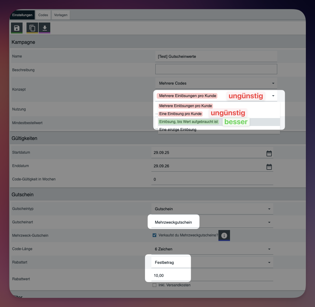Wir haben jetzt auch so was gemeldet bekommen. Einstellungen im Gutschein, sind aber wie bei Sven. statt Restbetrag 7,36€ werden 109€ eingelöst über den gesamten Wert des Artikels.