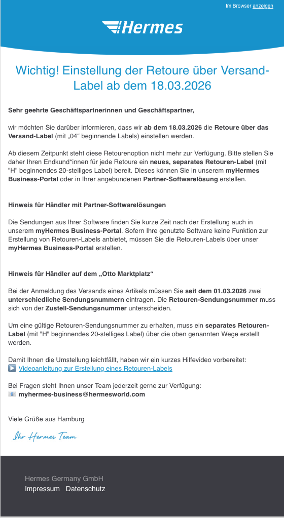 Wir selbst haben von Hermes erst am 05.03.2026 eine Information erhalten, dass: