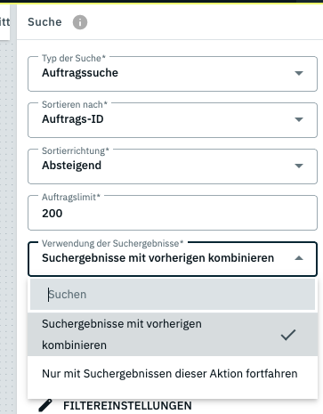 Suche sucht im System nach allen Aufträgen, die den jeweiligen Filtereinstellungen entsprechen, um sie dann gemeinsam durch die weiteren Flow-Schritte zu führen.
