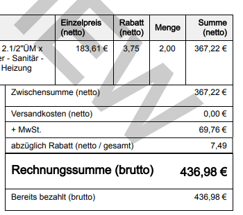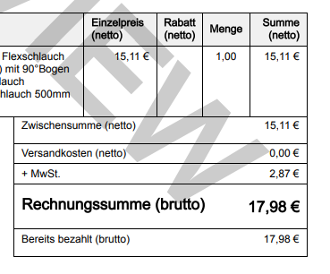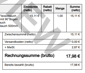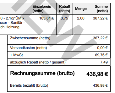 Ansonsten würde ich für den Rabatt keine extra Spalte machen, sondern unterhalb des Preises (bei dir Einzelpreis (netto) und/oder Summe (netto)) und in den Summen variabel darstellen.