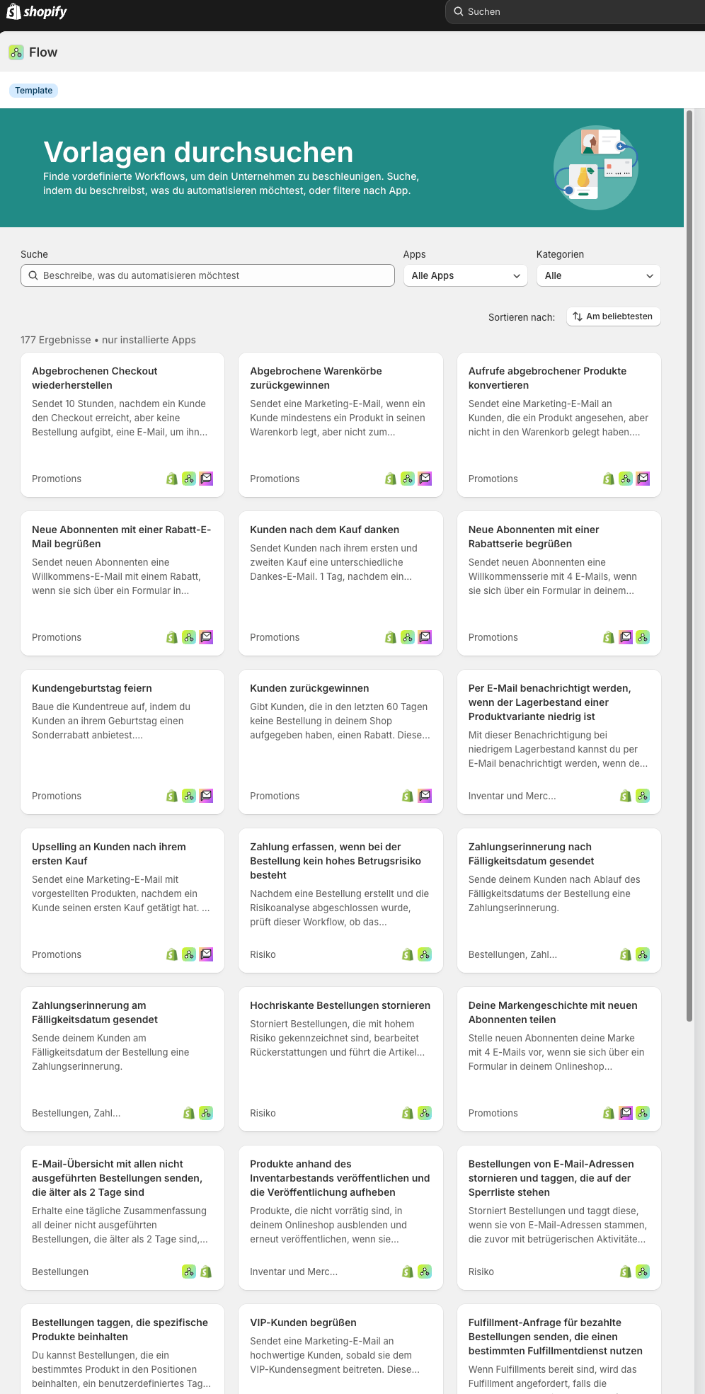 Und Shopify liefert schon einen Haufen sinnvoller Vorlagen mit, die man sich direkt aktivieren kann, damit man nicht von 0 starten muss.