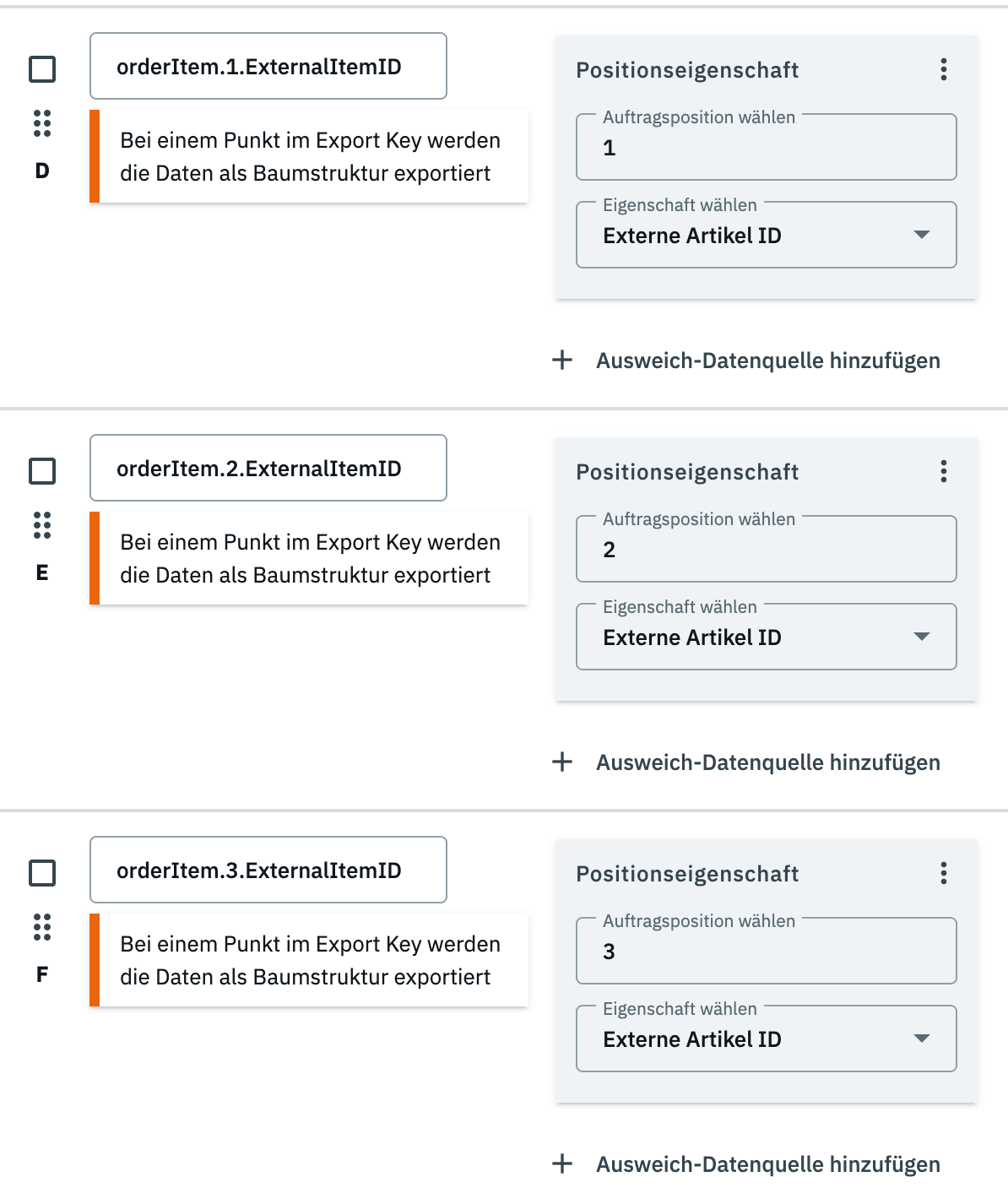 „Externe Artikel ID“ ist überall gewählt und Auftragsposition ist gesetzt:
