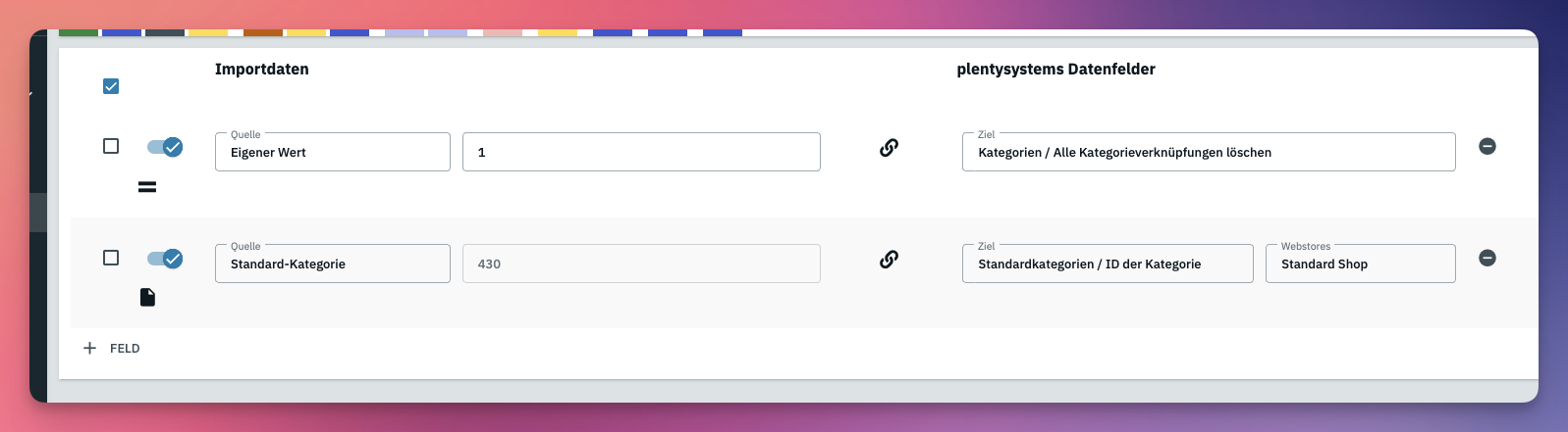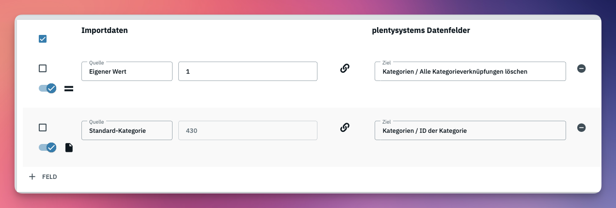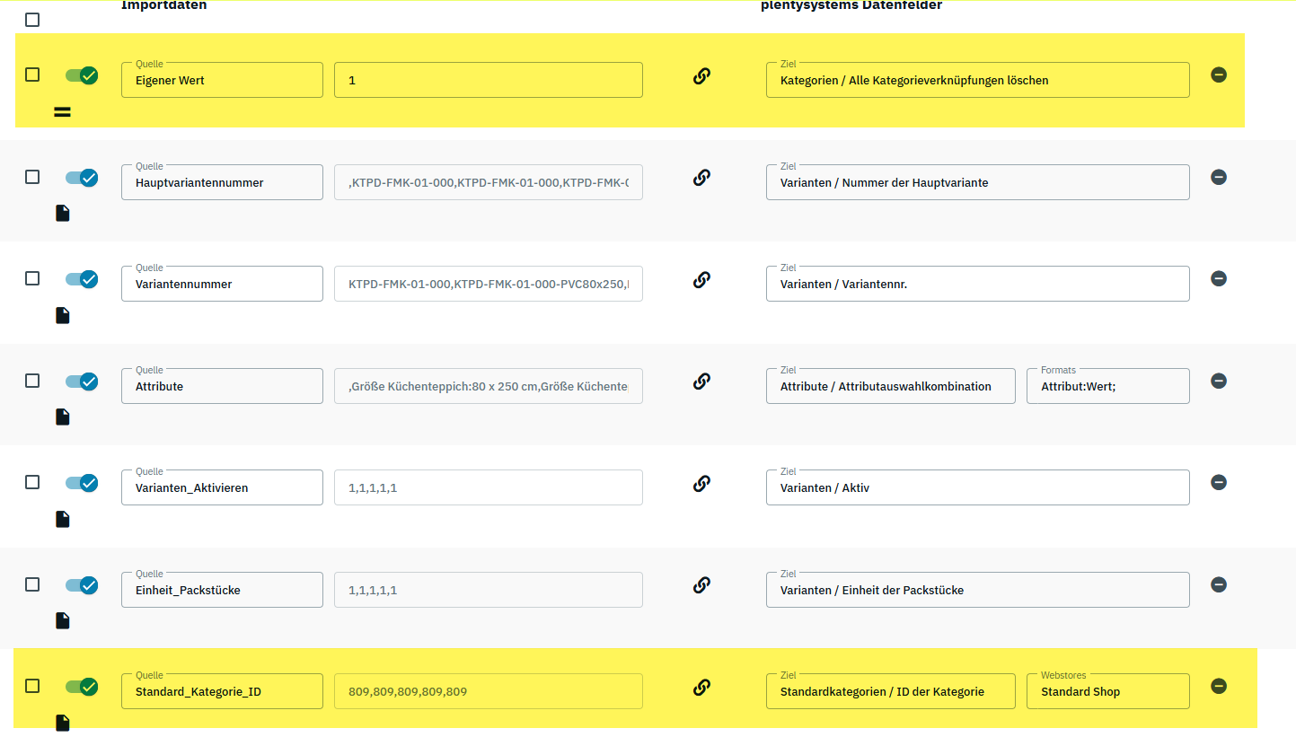 Ich lege bei Importen mit dem Ziel Artikel zu aktualisieren oder neu anzulegen die Zuordnung so an, dass Sie jeweils einen Wert zur Kategorie und Standardkategorie beinhalten.
