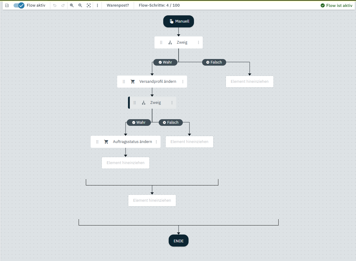 Ich bekomme den erstellten Flow nicht in der Artikel-UI angezeigt. Der Flow ist auf aktiv gesetzt und (erst einmal) auf manuellen Start. Wenn ich ihn über das Flow-Menü starte und dort die Auftrags-ID vom Testauftrag hinterlege, passiert nichts. Der Status zeigt nur an, dass der Flow gestartet und abgeschlossen wurde – mehr nicht. Es gibt keine Änderung am Versandprofil.