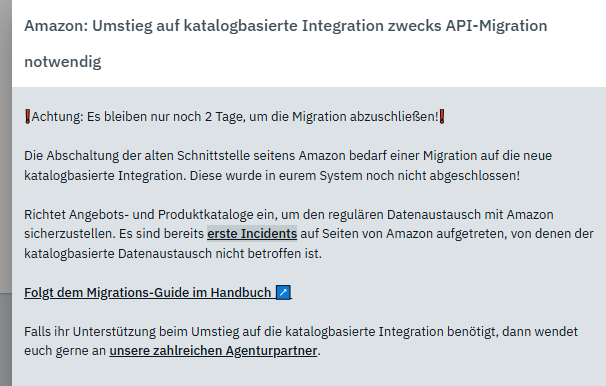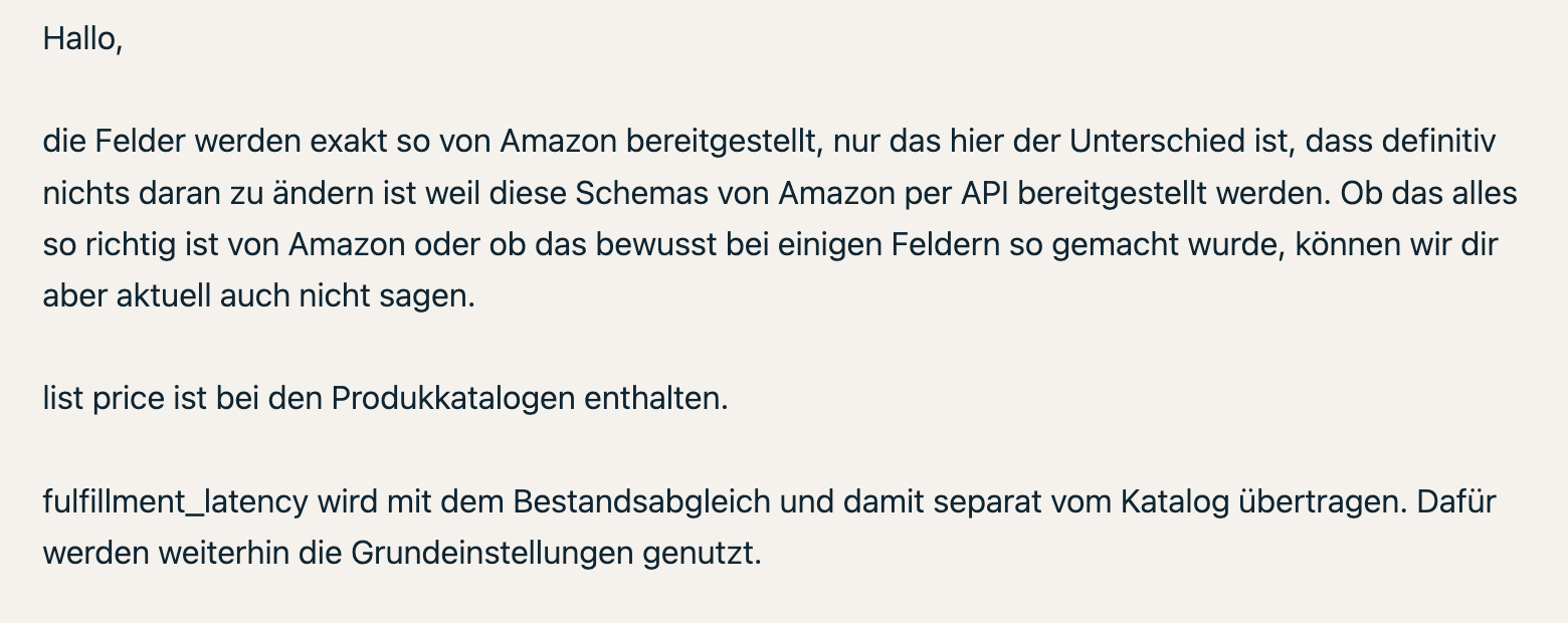 Wie stellt man eigentlich fest, ob die vorgenommene Änderung (z.b. Preis oder Bestand) nun über den neuen Offer Katalog oder über das bisherige Format funktioniert hat? Man soll ja den Artikeldatenabgleich unter Einrichtung>Amazon>Einstellungen angeschaltet lassen. Da lief ja bisher unser Datenabgleich… oder stehe ich da irgendwie auf dem schlauch?