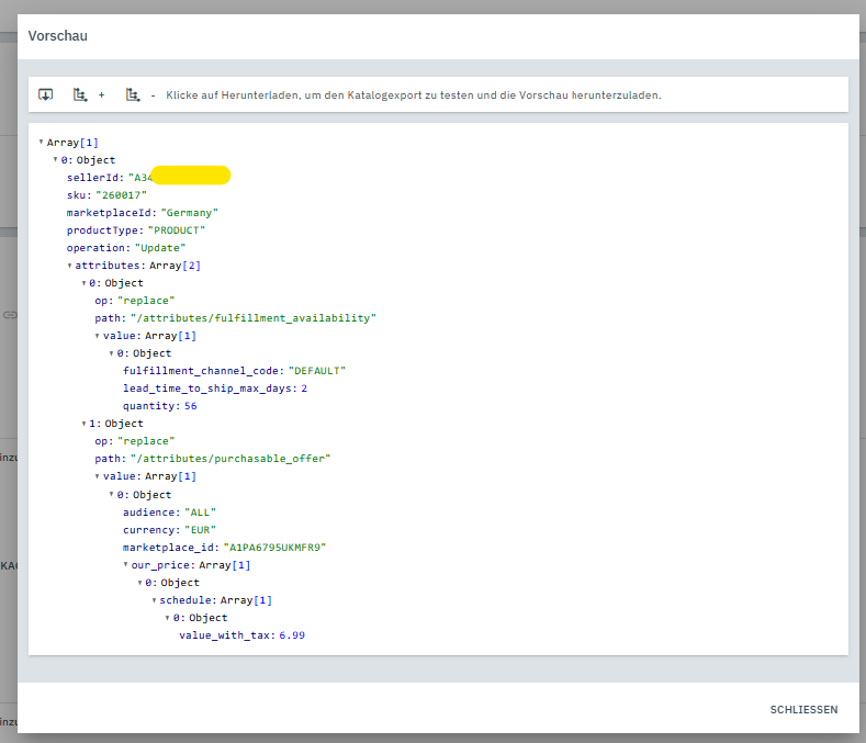 Im Katalog verwende ich JSON (PATCH) und habe ich ein Filter mit einem Produkt zum Testen. Die Vorschau sieht ganz gut (Der Preis von 6,99 EUR ist ein Testpreis, der auf dem Produkt bei Amazon ersetzt werden soll):