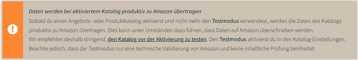 Moin Thomas, für die aktive Übermittlung der Produkte zu Amazon müsst ihr den Testmodus deaktivieren. Bei unserem Angebotsexport (wir senden nur Angebote) gab es dann auch weitere Fehler.