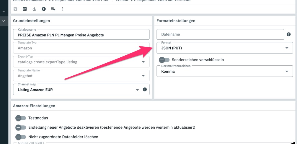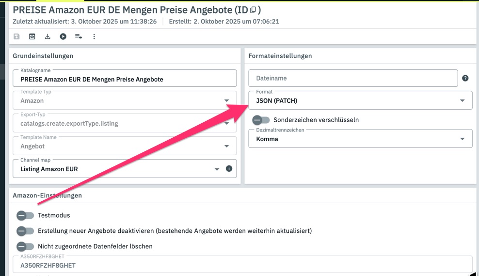 Einrichtung → Märkte ->Amazon → Datenaustausch → Datenexport