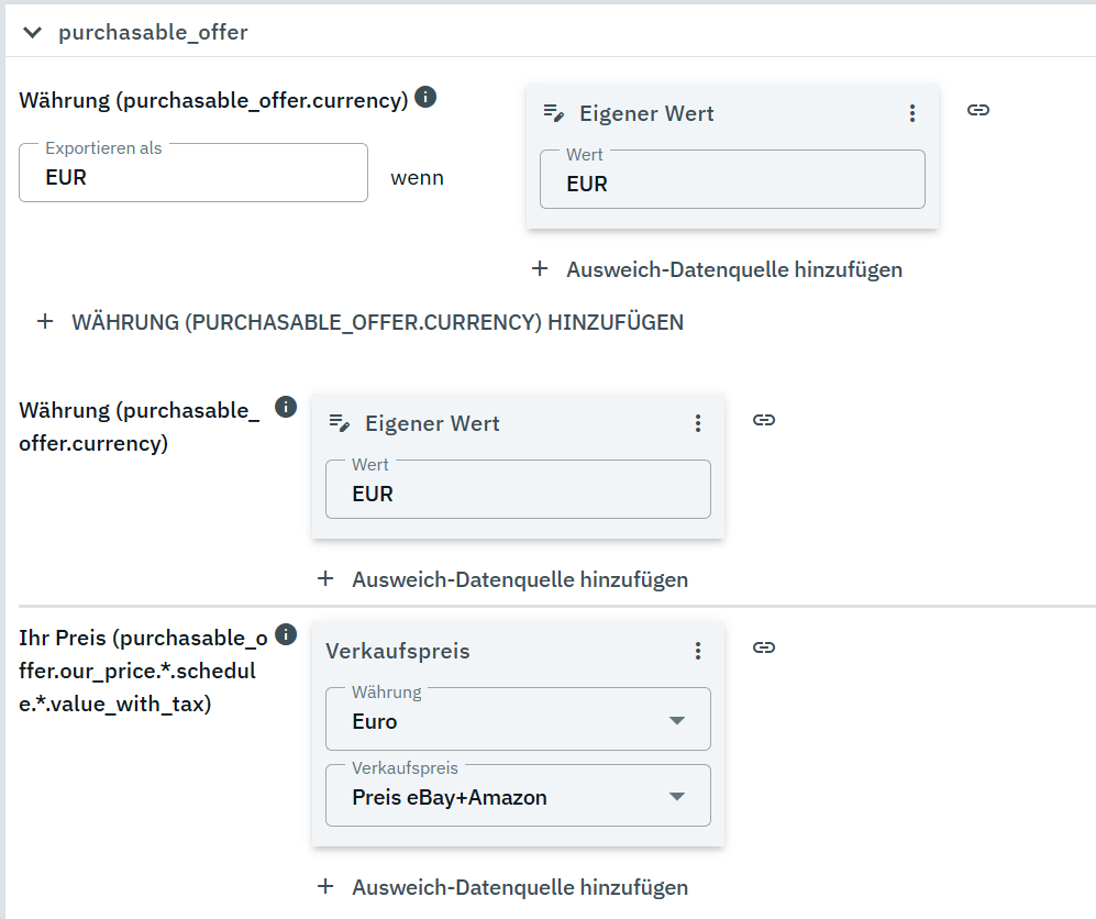 PS. ich glaube, bei der obersten Einstellung mit EUR stand erst links kein “EUR”. Hast du das hinzugefügt? du hast doppelt EUR verknüpft. ich weiß nicht, ob der Katalog damit zurecht kommt (ich glaube sowas hier schon mal gelesen zu haben)
