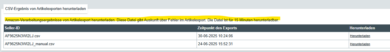 Amazon-Verarbeitungsergebnisse von Artikelexport herunterladen. Diese Datei gibt Auskunft über Fehler im Artikelexport. Die Datei ist für 15 Minuten herunterladbar.