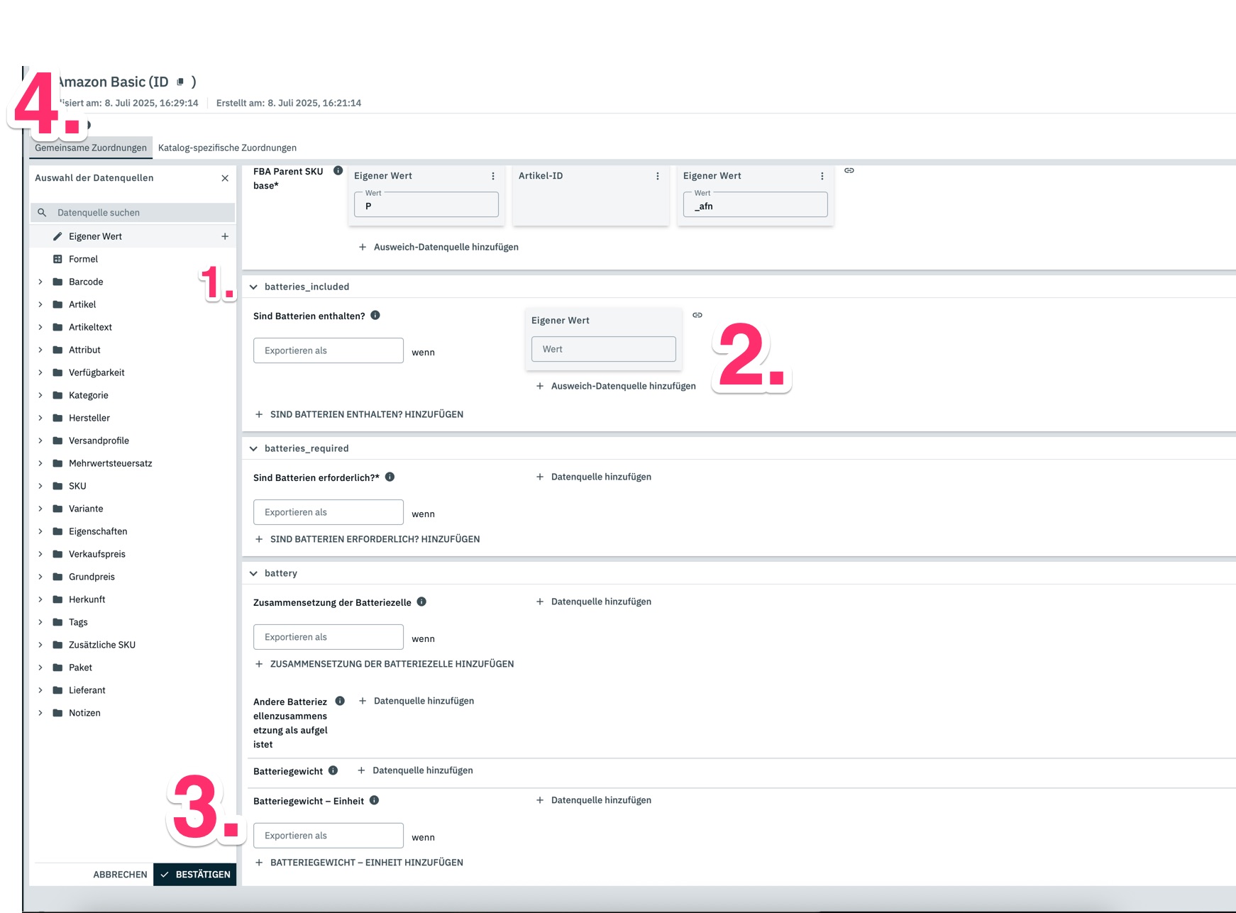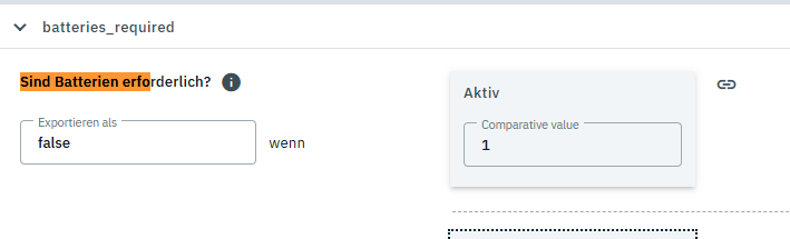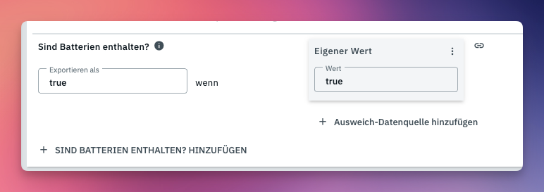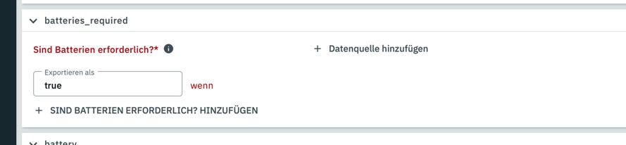 du musst bei z.b. “Sind Batterien enthalten?” einen Wert bei “Exportieren als” hinterlegen sonst klappt das nicht.