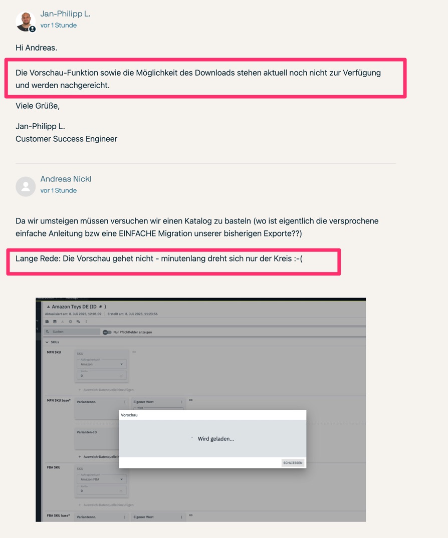 ich beobachte den „Value for ‚Fulfillment Availability‘ Fehler auch in einigen Systemen. Meine erste Vermutung ist, dass es mit Paketartikeln zusammenhängt. Habe mal ein Tikcet erstellt und wart jetzt auf Antwort von Plenty.