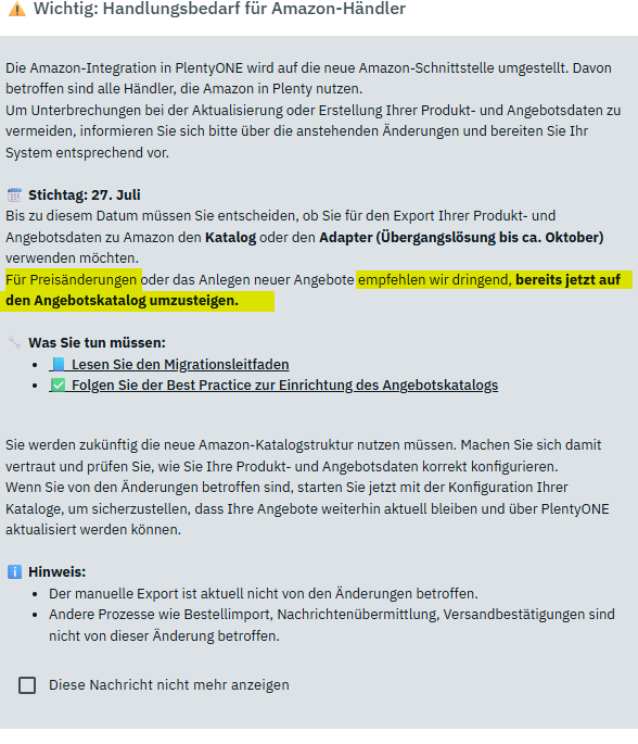 Blöd ist natürlich, und das war bei mir gar nicht so hängen geblieben, der Hinweis auf die Einstellung der Weiterentwicklung des Bestands- und Preisabgleichs ab dem 15.07.25. Es ist klar das da keine neuen Features mehr kommen werden, aber ich hoffe das damit nicht gemeint ist das eventuell auftretende Probleme nicht mehr angegangen werden.