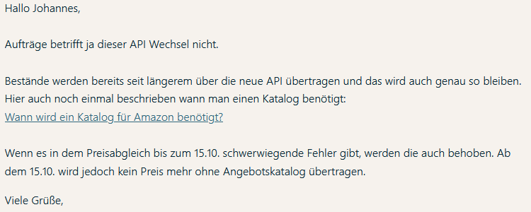 Ich habe heute auf mein Ticket eine Rückmeldung erhalten. Für unseren Use-Case, bei dem Plenty ausschließlich Bestandsaktualisierungen und Auftragsimport macht, wird sich auch nach dem 15.10.25 nichts ändern. D.h. wir müssen keinen Katalog anlegen.