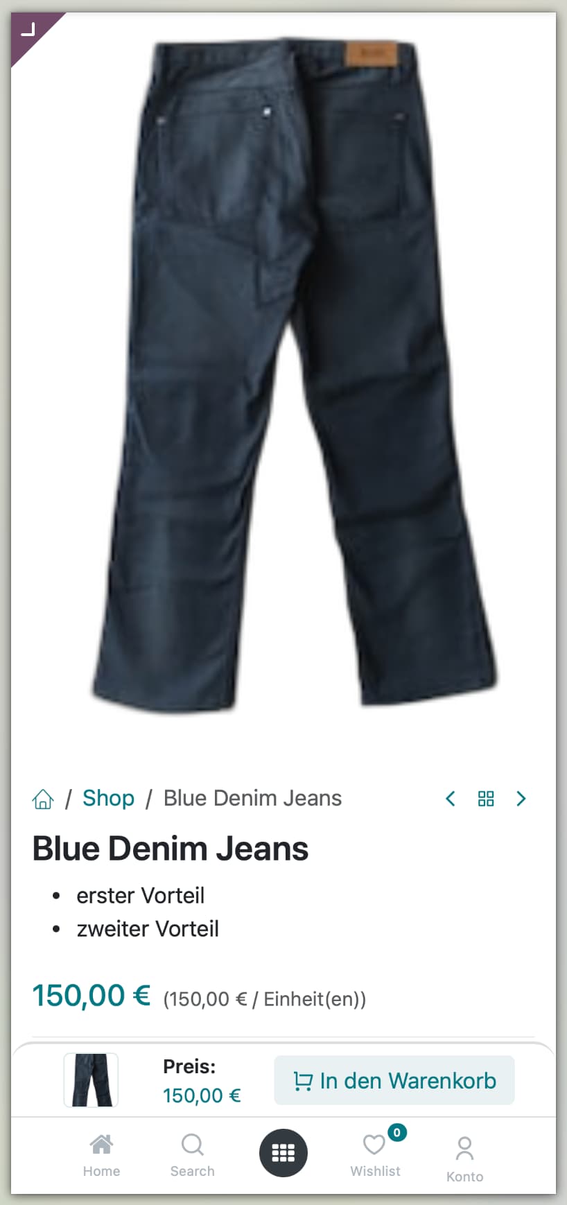 Hier einfach mal ein Screenshot aus unserer Staging-Umgebung. Bitte nicht über die Auflösung des Bildes wundern. Das ist ein reiner Testartikel. Das ist die Produktansicht leicht nach unten gescrollt, damit man ein wichtiges Detail erkennen kann.